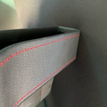 Our black faux-leather build is cruelty-free while still retaining a luxe feel and look. Red stitching accents for eye-popping detail.